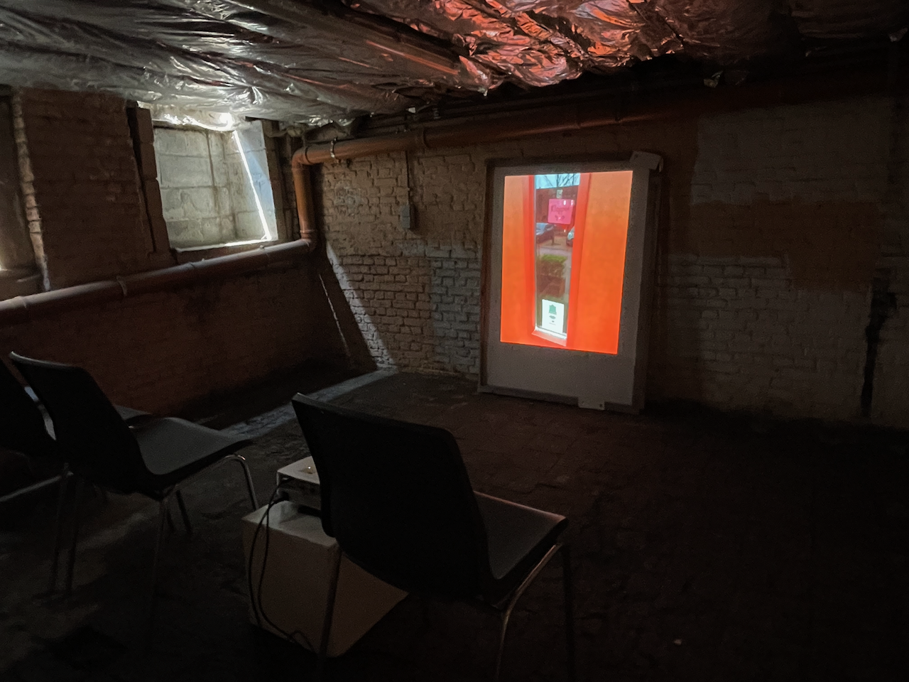 View from Baroeg Mulder’s installation ‘a coffee break room’ at Phatic Utterances, inSitu3 house Dambruggestraat 356, Antwerp (BE)